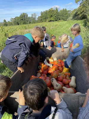 Im September erntete die Klasse 2a der Grundschule Öhningen ihre selbst gezüchteten Kürbisse. Bei der großen Ernte wurden sie tatkräftig von den Kindern des Kindergartens Öhningen unterstützt. Als Dankeschön suchten sich die Kindergartenkinder Kürbisse aus, die sie zu einer leckeren Kürbissuppe verarbeiteten und im Kindergarten genießen konnten.